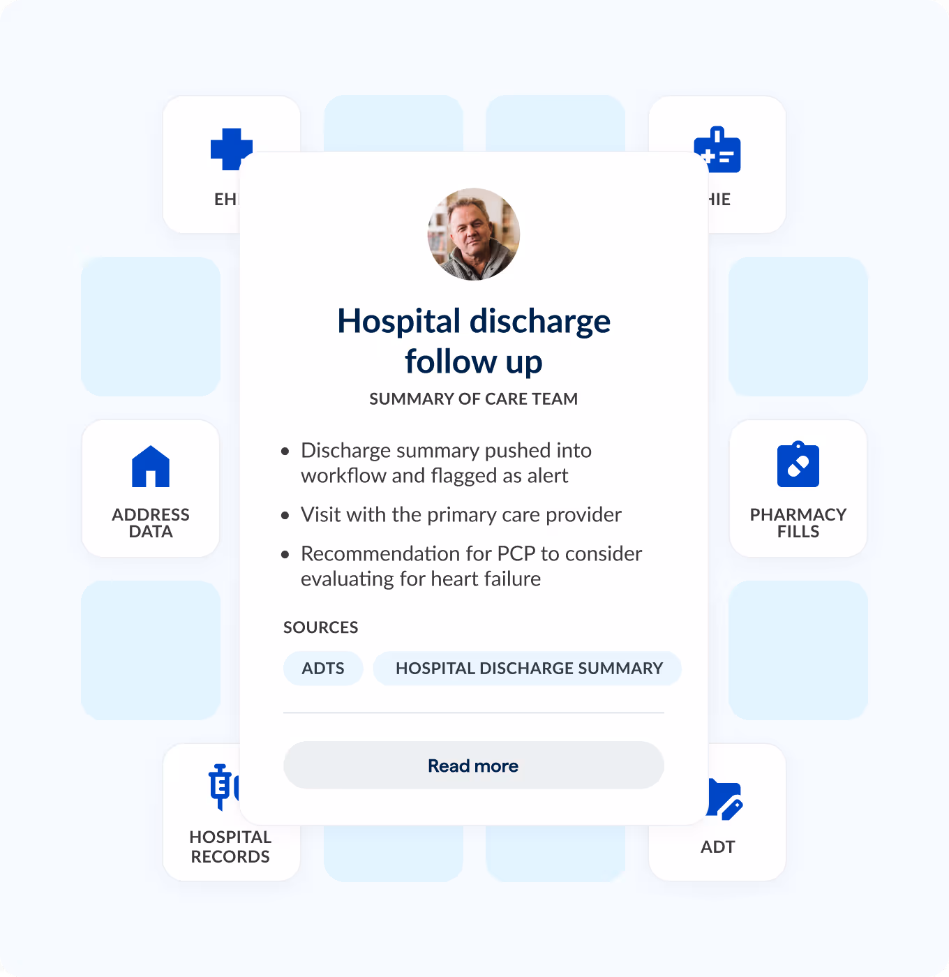 Get insights directly within existing workflows: EHRs, care platforms, or exports. At discharge, point of care, or on schedule.